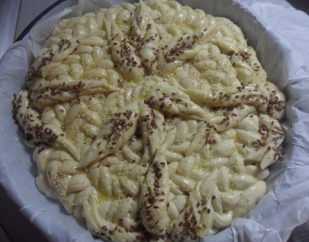 IKAFETO, при "разходки" из нета в търсене на нещо интересно, попаднах на питката в тоя блог, хареса ми, преведох си рецептата с помощта на гугъл и всъщност нея правих. Оставих тестото една идея по-меко, просто така са ми по-вкусни питките, но пък не получих ефекта от снимките в блога. Всъщност пекох в по-малка тава, големите ми бяха заети, мисля, че и това оказа влияние. И все пак стана много красива питка, съжалявам, че ме няма много по фотографирането, на живо изглеждаше много по-добре. Ако имаш проблем с превода, ще ти препиша от листа продуктите, разпечатах тогава. Мисля, че с всякакво тесто ще стане, приятно ми беше да я подреждам. А, и си я правих както и другите, омесих, оформих, оставих да втаса в леко загрята фурна, намазах с яйце отгоре и пекох на 180 град, както и другите ми питки. Peace