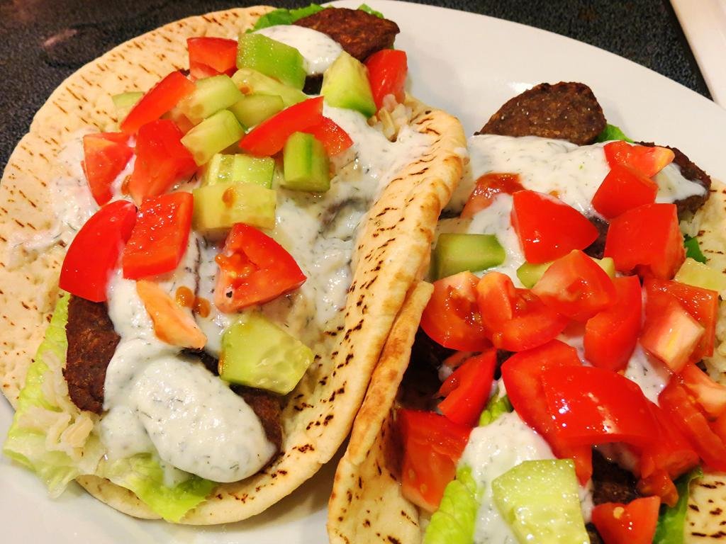 Телешки кюфтета и картофки на фурна, придружени от зелена салата + краставици.