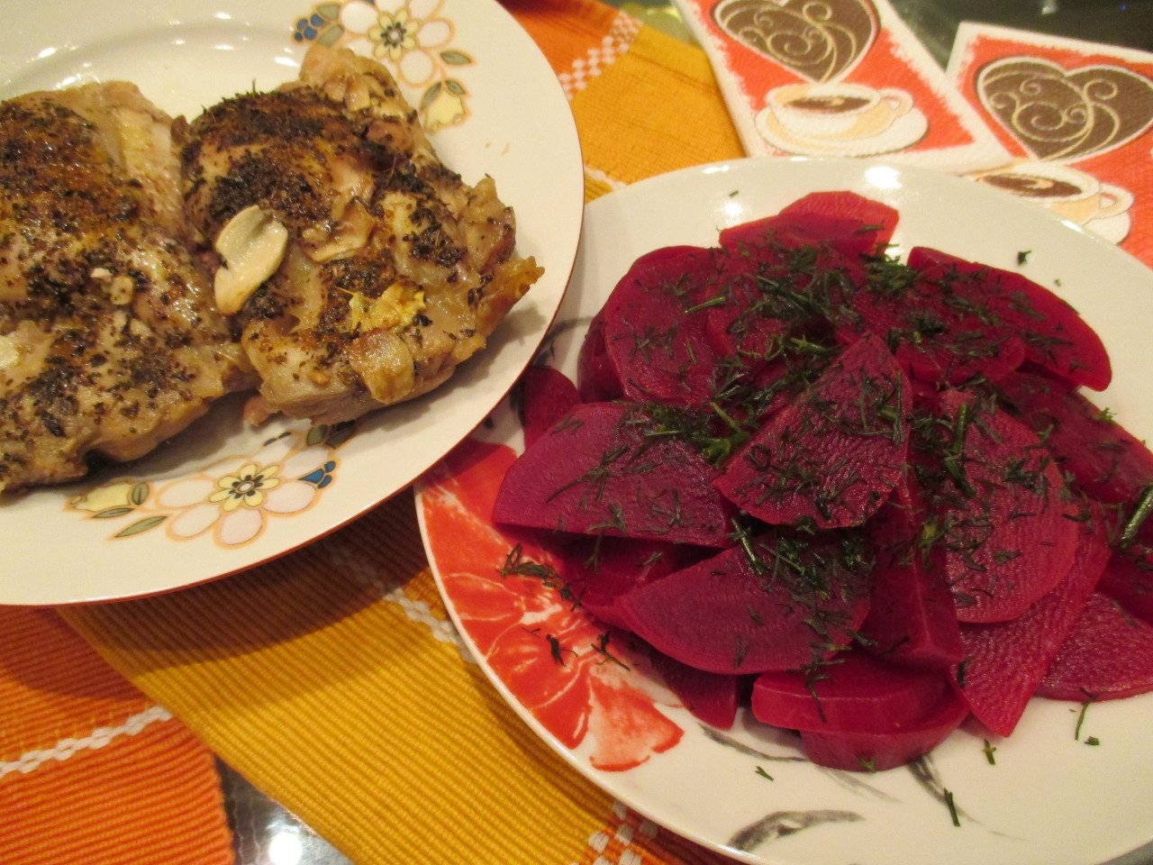 При мен обикновени и не особено интересни неща тази седмица- кисело зеле на фурна, нещо като пилешка кавърма, пилешки пържоли и червено цвекло.