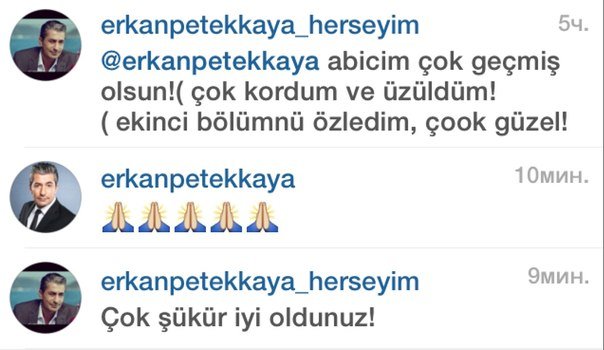 Со своей страницы в инстаграмме я отправила сообщение Эркану. В нем я написала, что очень расстроена произошедшим и пожелала скорейших выздоровлений на что Эркан ответил 🙏🙏🙏. Думаю, что это значит с ним все в порядке! Еще я написала, что вторая серия было просто замечательной!