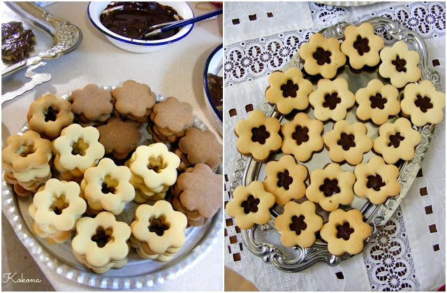 Тестото разточвам с дебелина 2-3 мм, като за основа ползвам какаовото тесто, а за отгоре бялото тесто, което изрязвам с формичка с дупка в средата. Най- добре е да се разточва по малко от тестото, и кото омекне повече да се прибере за малко в хладилника.  Бисквитките подреждам в тава покрита с хартия за печене. Пека в предварително загрята фурна на 180 градуса около 5-6 мин на тава.