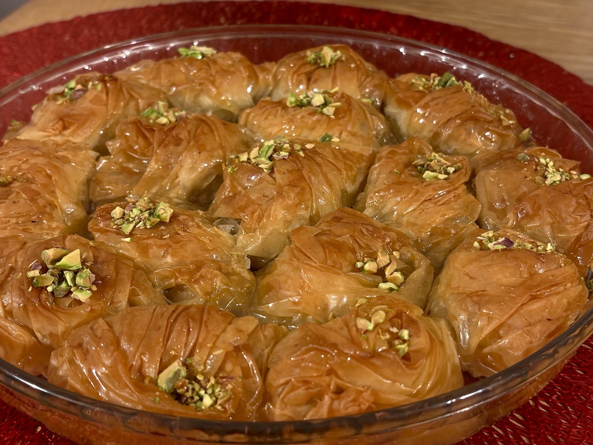 Мини баклавата е готова. Среднощна снимка с лоша светлина. Този път в малка тава за пай, да намалим калориите и да остане повече място за останалите благини.