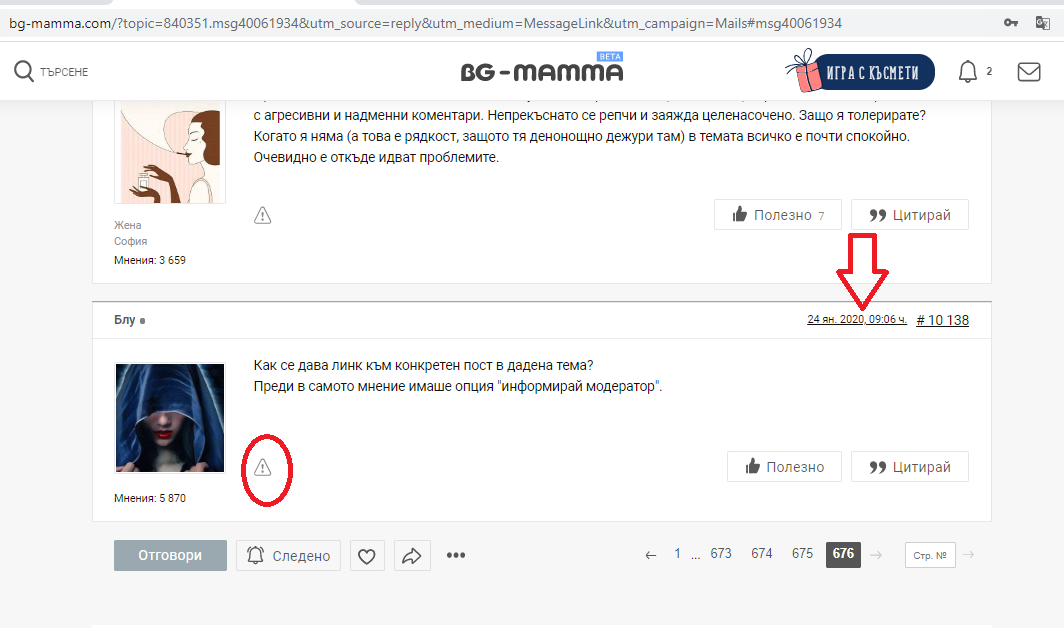 Удивителният знак е "информирай модератор". Линк може да вземеш с десен бутон на мишката от означеното под стрелката.