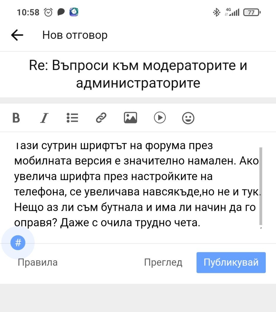 Тази сутрин шрифтът на форума през мобилната версия е значително намален. Ако увелича шрифта през настройките на телефона, се увеличава навсякъде,но не и тук. Нещо аз ли съм бутнала и има ли начин да го оправя? Даже с очила трудно чета. Ето за сравнение.