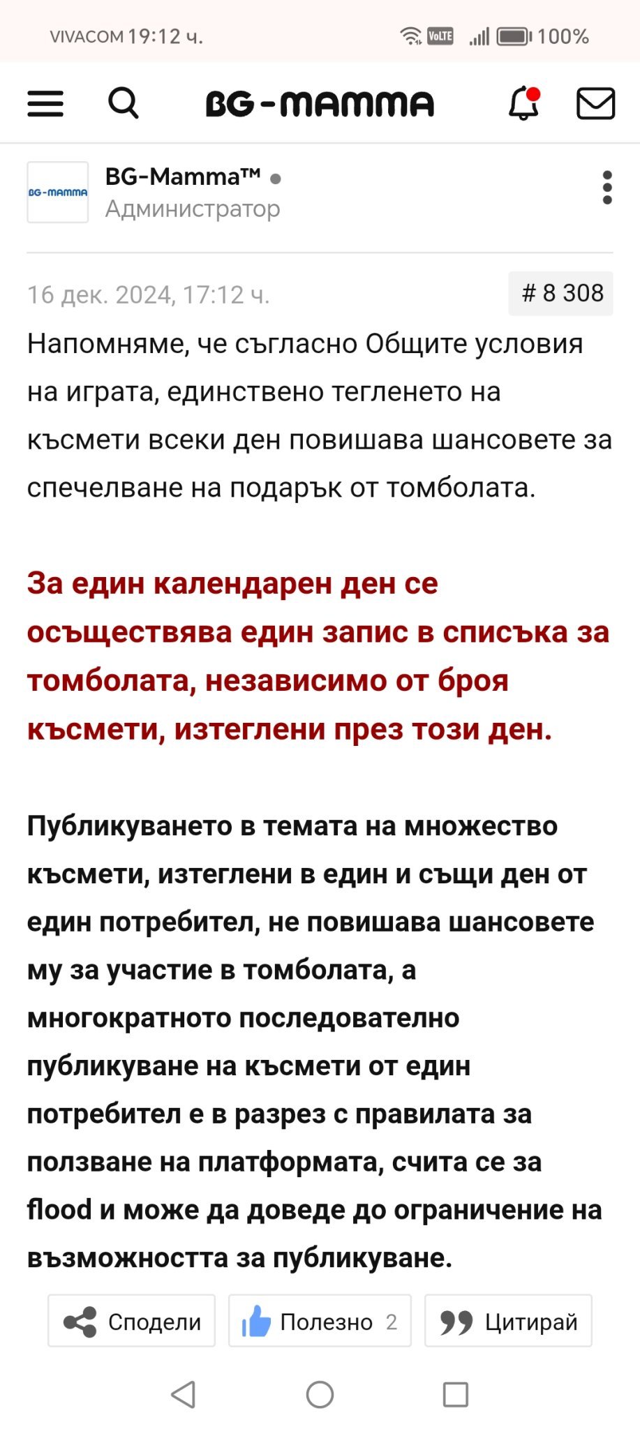 Достатъчно е да се изтегли и публикува един късмет за денонощие, за да се участва в томболата. ....