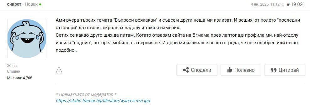Сетих се какво друго щях да питам. Когато отварям сайта на Бгмама през лаптопа,в профила ми, най-отдолу излиза "подпис", но  през мобилната версия не. И дори ми излизаше нещо от рода, че не е одобрен или нещо подобно..