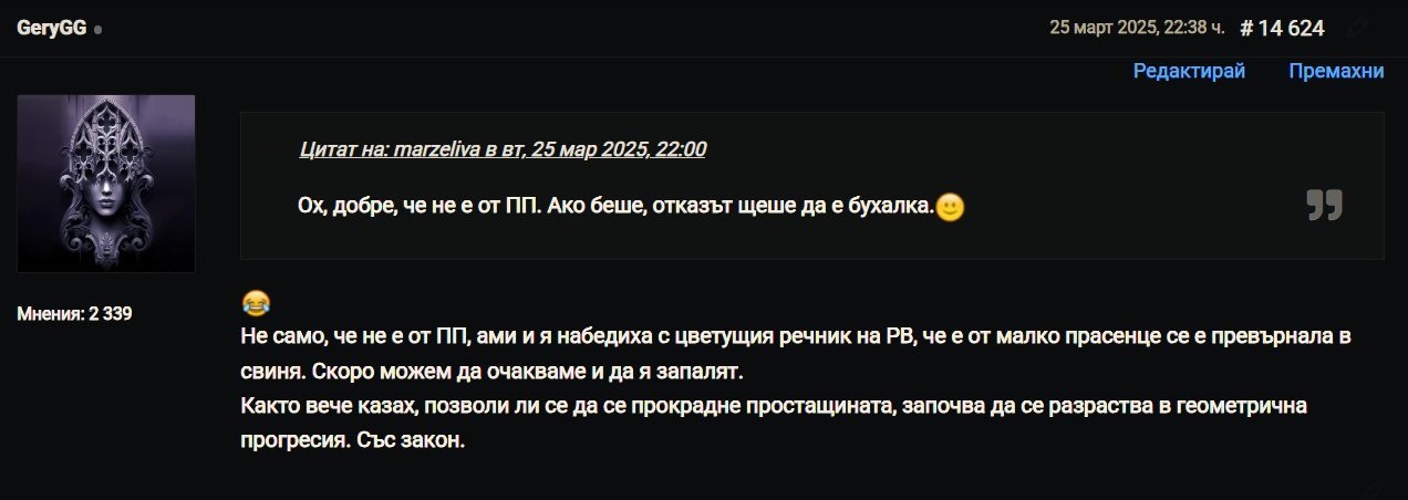 Интересно - мои мнения в политическата тема, споменаващи тази партия /ПП/ биват редовно трити, но явно не е проблем да се споменават партии, защото всяка друга, особено "Възраждане", биват обсъждани напоително. Като се замисля, критиките по адрес на партии явно също не са забранени, защото всяка друга без тази партия бива редовно критикувана и мненията не се трият.