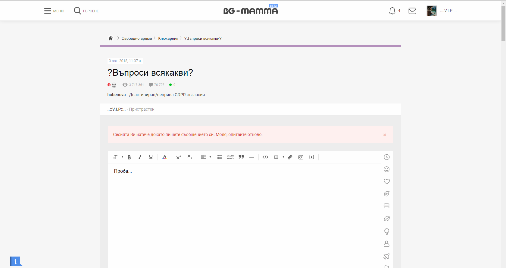 Какъв е проблемът с публикуването на мнения? Изписва ми "изтекла сесия". Никога не съм имала подобен проблем и при цял ден включена бг мама. Излизах - влизах - пак не става. Чистих история, кеш, всичко - не става.