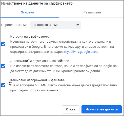 chrome://settings/clearBrowserData  -  постави това в адресното поле на Хром
