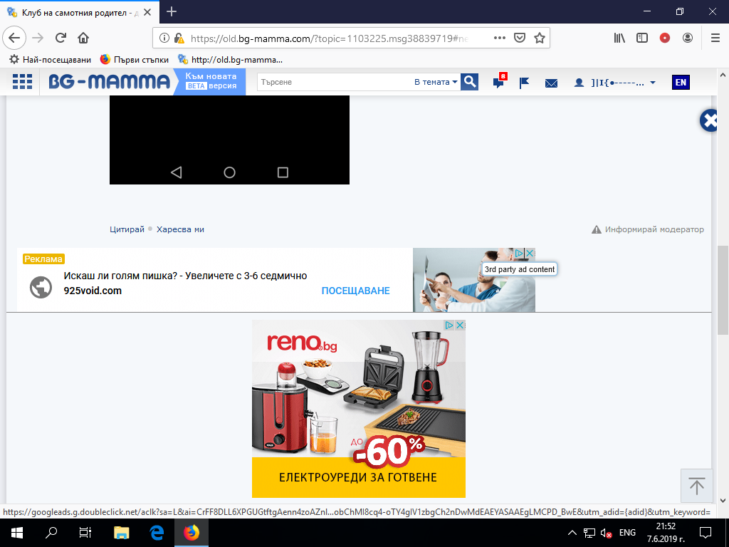 Мен в мобилната версия, на тази тема ме хвърли първо най-долу. Иначе си сложих АдБлок и вече не се дразня толкова от реклами, по-големи на дължина от екрана ми.