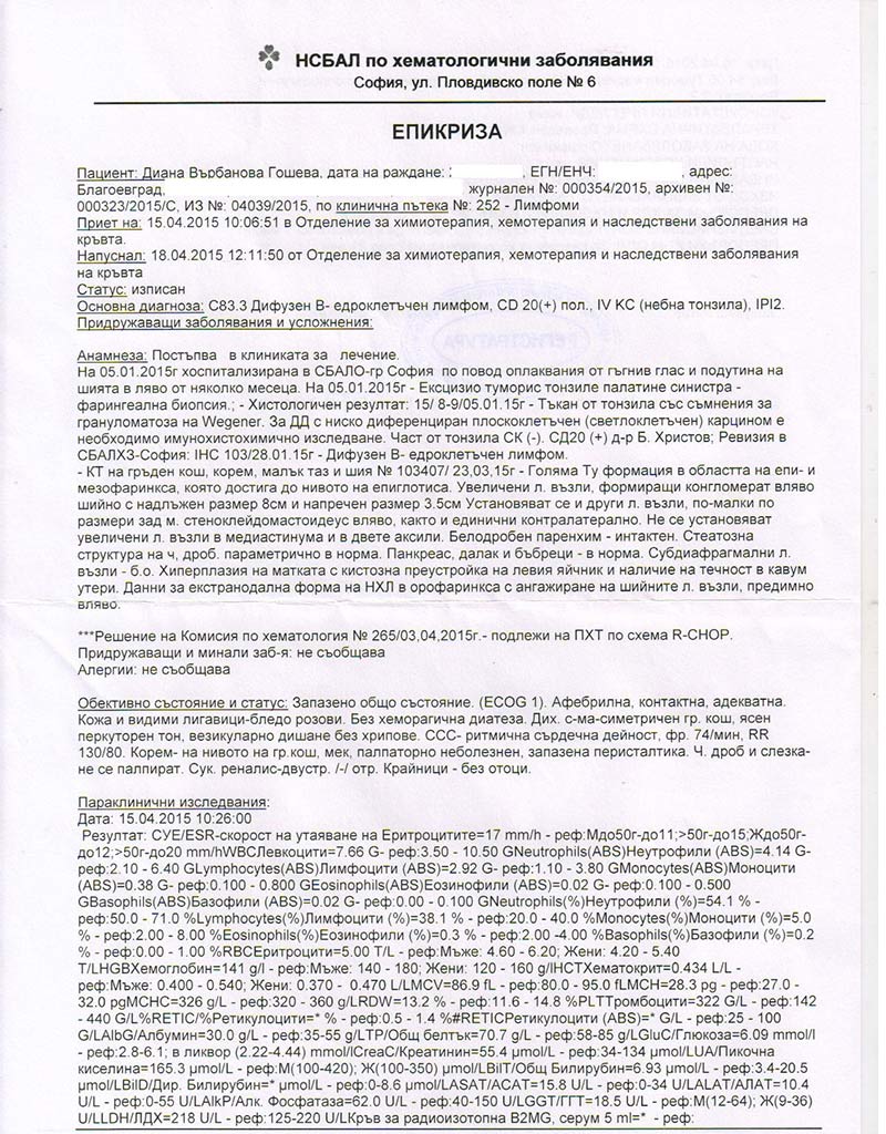 Малко от вас обаче знаят, че тя е болна от злокачествено онкологично заболяване - дифузен Б едроклетъчен лимфом СД 20+, неходжинков лимфом...