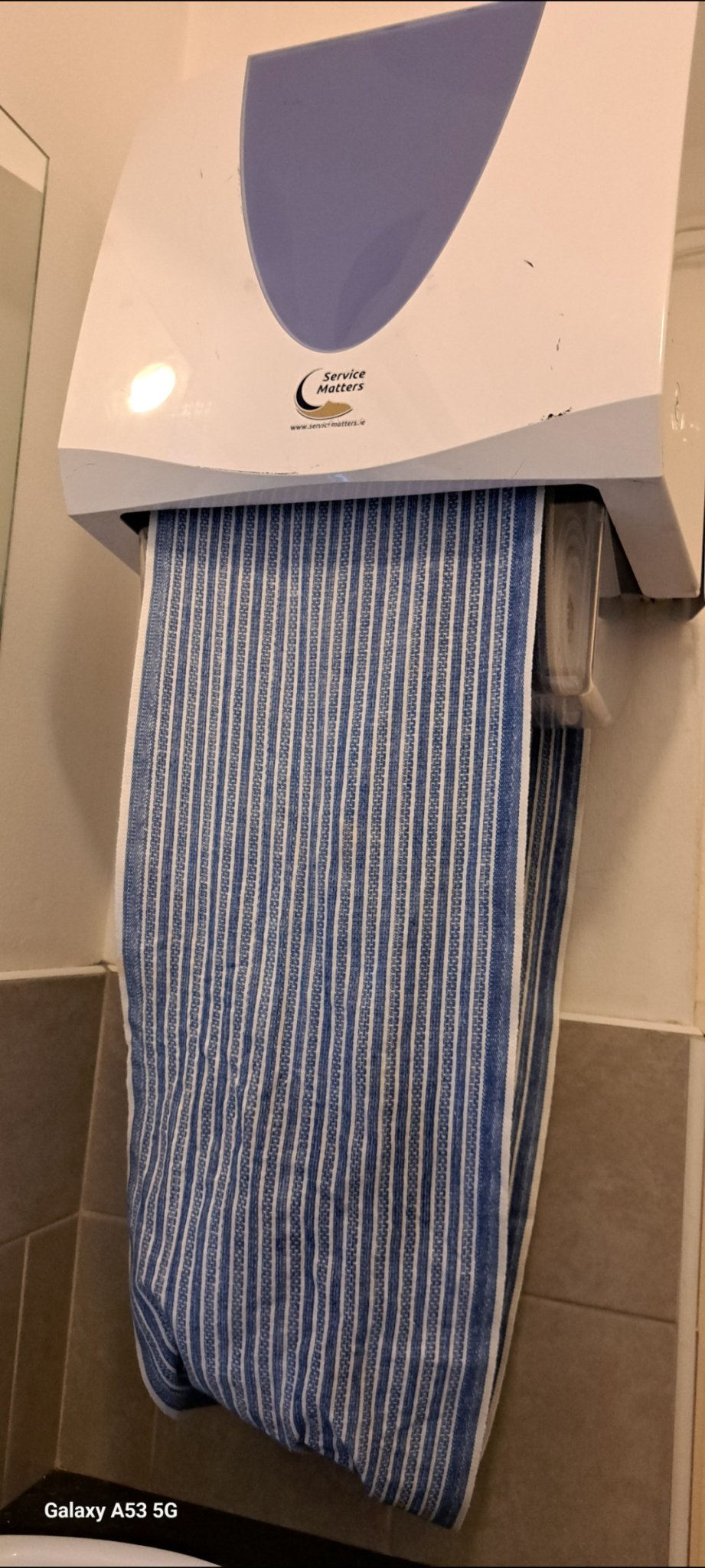 Ролка плат която се върти. Теглиш отгоре да излезе чиста кърпа и се бършеш. Мръсната отива на ролката. Направо се потресох като го видях. Излязох си с мокри ръце.