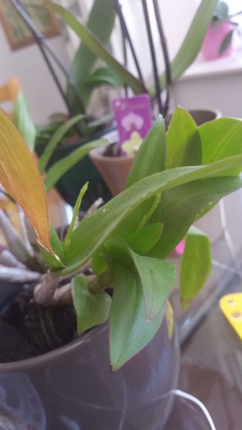 Първо започвам с новината, че малайзийската орха, за която Реге помага да пресадя, не само се развива прекрасно, ами и май ще цъфти. Вижте и вие, но ми се струва, че са цветоноси. Това листенце е пречупено от дългия път, не го пипам, то само ще си падне, да не ви залъгва, че е наполовина покафеняло.: