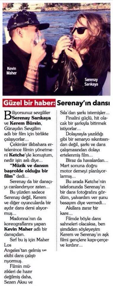 Малко инфо от рускините: Журналист разговарял с режисьора на "Добро утро, любима" - Ketche, за отлагането на снимките на филма. "Това е филм ,където главна роля имат музиката и танците..." е казал режисьорът. И продължава: "Серенай ще играе танцьорка. Но не само Серенай, Керем и останалите актьори вече почти месец вземат уроци по танци.С тях се занимава хореографът Кевин Махер, който е работил със самата Мадона! Специално за това той дойде от Лос Анжелис."