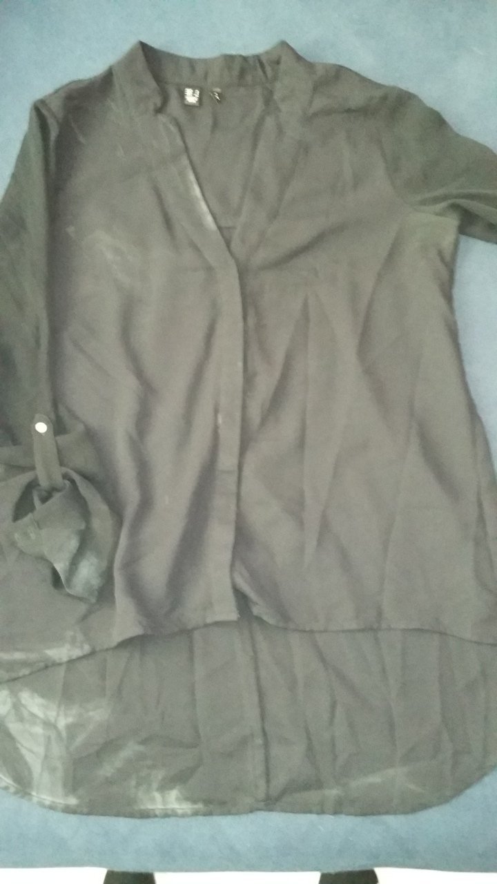 Асиметрична черна риза, цялата е прозрачна, само от пред е направена по-плътна и да пада тежко. Навиват се ръкавките, страхотно седи! Побеляла е заради дезодоранта ми  ooooh!