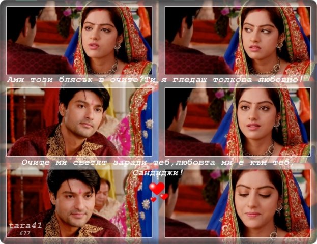 Много бяха сладки Сурадж и Сандия като седнаха един срещу друг по време на церемониите и Сурадж започна да рисува сърце на Сандия в брашното или захарта - не разбрах какво точно беше.  newsm76 newsm76 newsm76 Сандия първо се цупеше и се правеше на ревнивка заради Кавита, но Сурадж много хубаво каза на Сандия: "Очите ми светят заради теб. Любовта ми е към теб Сандия" txtloves  txtloves txtloves smile3521 hug Супер сладки са двамата и как влюбено се гледаха само - напълниха ми душата!  Heart Eyes Heart Eyes Heart Eyes Сервираха им някакво ядене, но Сандия не искаше да яде, защото щяла да надебелее - Сурадж й каза, че няма нищо против - тръгна да й дава в устата и тя го ухапа. Много са забавни - той как извика оххх пред всички ...  smile3532 Сантош го попита какво става, а Сурадж вика: "Сандия ме ухапа"  Joy Joy Joy Всички така ги пригледаха - стана им ясно, че двамата се закачат и си играят любовни игрички. А те как се гледаха само ...  Two Hearts Two Hearts Two Hearts Сурадж само как каза: "Сандия, какво правиш. Храня те с такава любов, а ти ме ухапа"smile3534 а Сандия вика: "Нима искаш да стана дебела. Не мога да си го позволя. Чакат ме трудни състезания - няма да ям толкова" Joy Joy Joy Тогава Сурадж й каза: "Не Сандия, нищо подобно. Любовта ми към теб няма да отслабне" - сладури ...  lovekiss lovekiss lovekiss