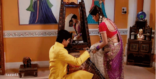 Уникална е сцената, когато Сурадж сложи на Сандия гривните на краката, после й помогна да се дооправи - явно й закопча ципа на сарито и после й сложи воала на главата. И всичко това докато са закачени един за друг с белезници!
