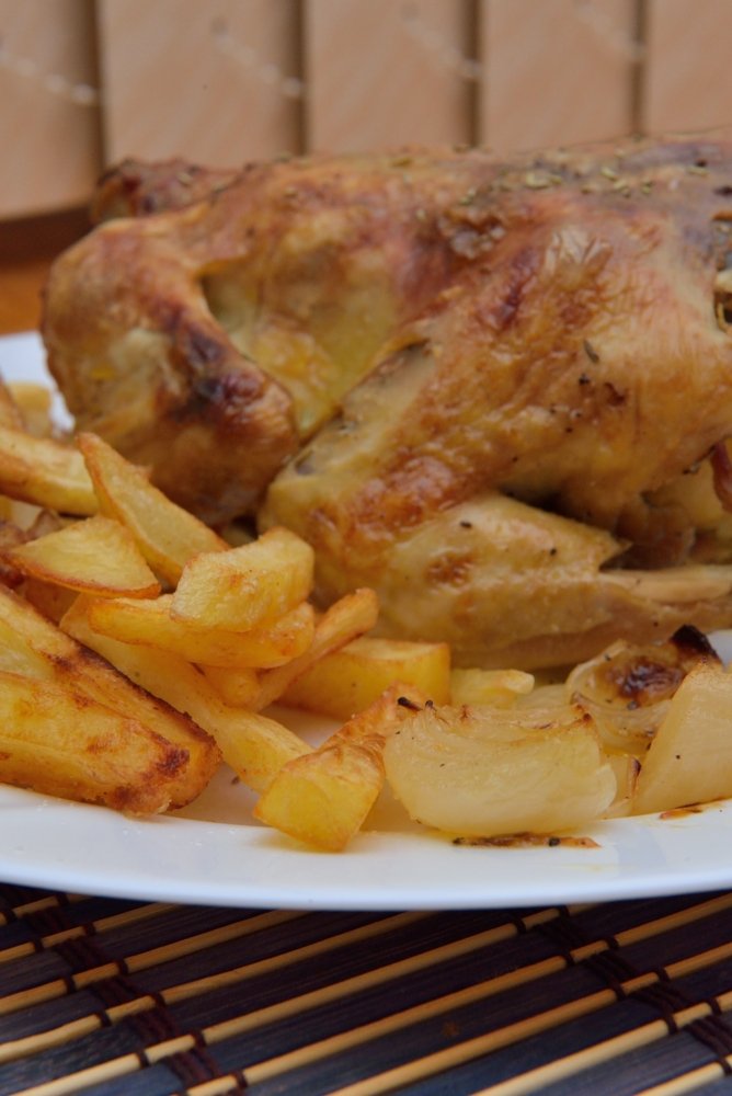 Печено пиле с розмарин и масло и пържени картофи с портокалова сол