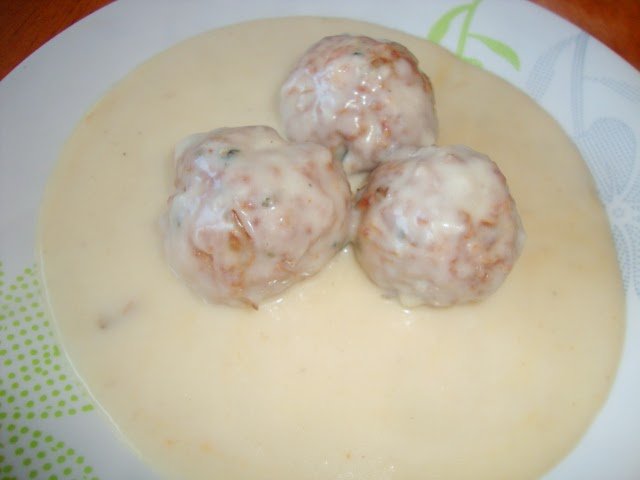 Пържени кюфтенца със сос бешамел и пилешки филенца със соев сос.