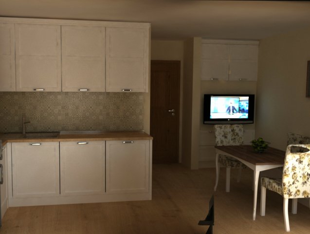 На мен лично гланцовите кухни никак не ми допадат - такава само на снимка да си я гледам и да не готвя в нея,имам и приятелка,която направи такава - сега съжалява,защото всяко докосване с пръст изисква забърсване.Ето го нашия проект,светла с гръб плочки ще е ,още мисля плота и вратичките,печката се наложи да е на усвоената тераса,защото коминът се оказа запушен.Хладилникът ми боде очите,но няма друго място...  Rolling Eyes Шкафчетата под и над телевизора не ми се иска да са бели,може би зависи какви маса и мебел ще изберем  Thinking И цветовете на стените изобщо не сам моите,обаче тепърва ще доизмисляме  Peace