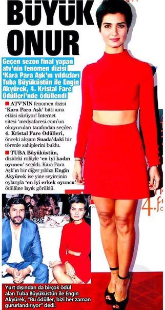 Феноменальный сериал Кара Пара Ашк студии Ай Япым закончился, а его воздействие продолжается. Интернет сайтом mediafaresi.com выбранные актеры на церемонии Хрустальной мыши получили свои награды. Туба Бюйюкюстюн была выбрана лучшей актрисой за роль в сериале. Энгина Акюрека - ещё одну звезду сериала Кара Пара Ашк, зрители разглядели достойным награды за лучшую мужскую роль.