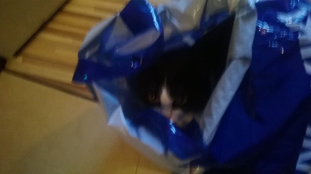 А аз изкарах Бъднивечер и Коледата заедно с моите дечица и внуче, беше ми направо вълшебно ... Скъсахме се от смях с тяхната Котка-идиотка. Набара един найлонов плик, намърда се в него и внучкото цяла вечер я влачеше из стаите. Тя съскаше и плюваше, но категорично отказваше да излезе от плика. Ето една снимка, не е излязла добре, но моя телефон така или иначе не прави добри снимки. Но ще й видите физиономията, която говори, че ''само да си ми барнал плика''!
