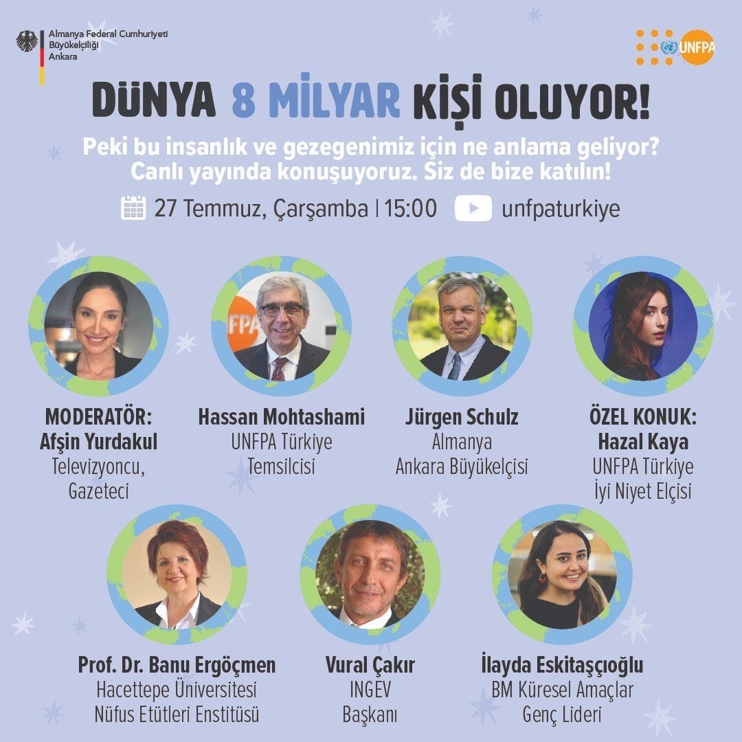 Анонс от UNFPA Türkiye: Ние първи обявихме в #WorldPopulationDay (Световен ден на населението): 15 ноември населението ще достигне 8 милиарда души. Разговорът ще е на тема какво означава това за човечеството и планетата. Ще участва и посолството на Германия в Анкара.