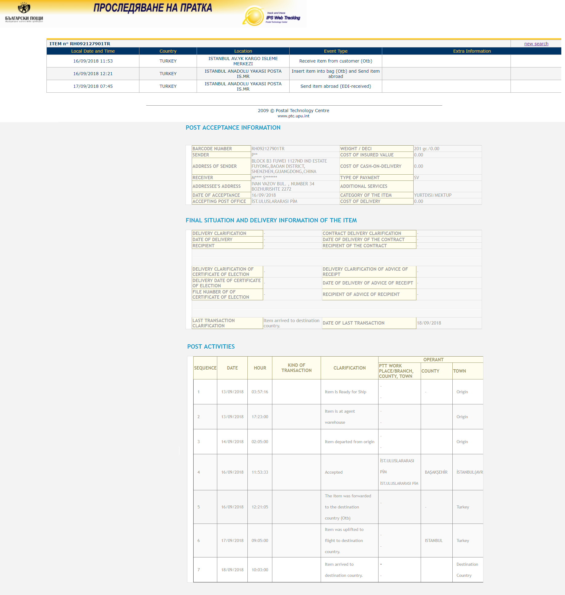 пратката ми е RW119631633CN, ще съм благодарна на помощ. В БГ пощи пише, че е получена в Благоевград 2720.