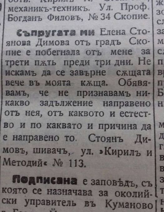 Първата таблица е потресаваща.А втората извадка от вестник да се изпрати на Македоно-Българската комисия,която не може да постигне споразумение по нито един въпрос.Там ясно си пише на чист български език..."съпругата ми...от гр.Скопие.."