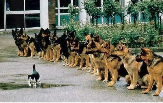 Първата снимка е тест на кучета порода Немска овчарка, за работа в германската Полиция? Доколкото знам, кучетата не трябва да реагират на котката-в противен случай са негодни за работа в Полицията.