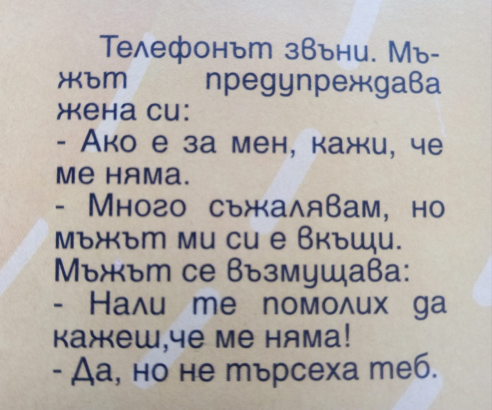 Друго е да имаш жена до себе си, нищо, че винаги иска да знае всичко. Нищо, че понякога не знае какво иска. Тя ще сготви и изпере, ще оправи леглото ти. После гардероба. След това ще оправи и теб. Ще облече твоя тениска и ще се гушне в теб. Друго е да имаш жена до себе си.