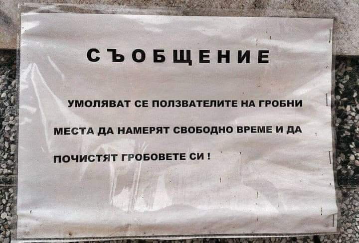 – Хайде докато се туткаш,(да умреш),те хората взеха най-хубавите места в гробищата!:laughing: