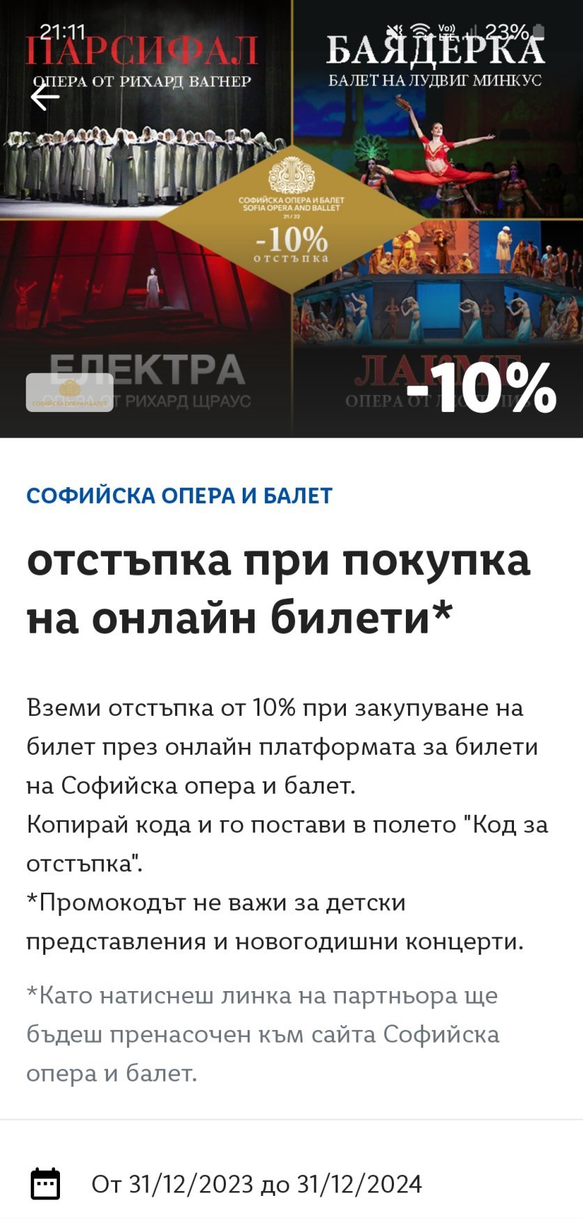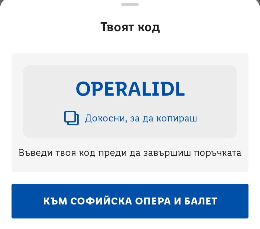 Онлайн за някои представления може да се ползва код за 10% отстъпка от Лидл.