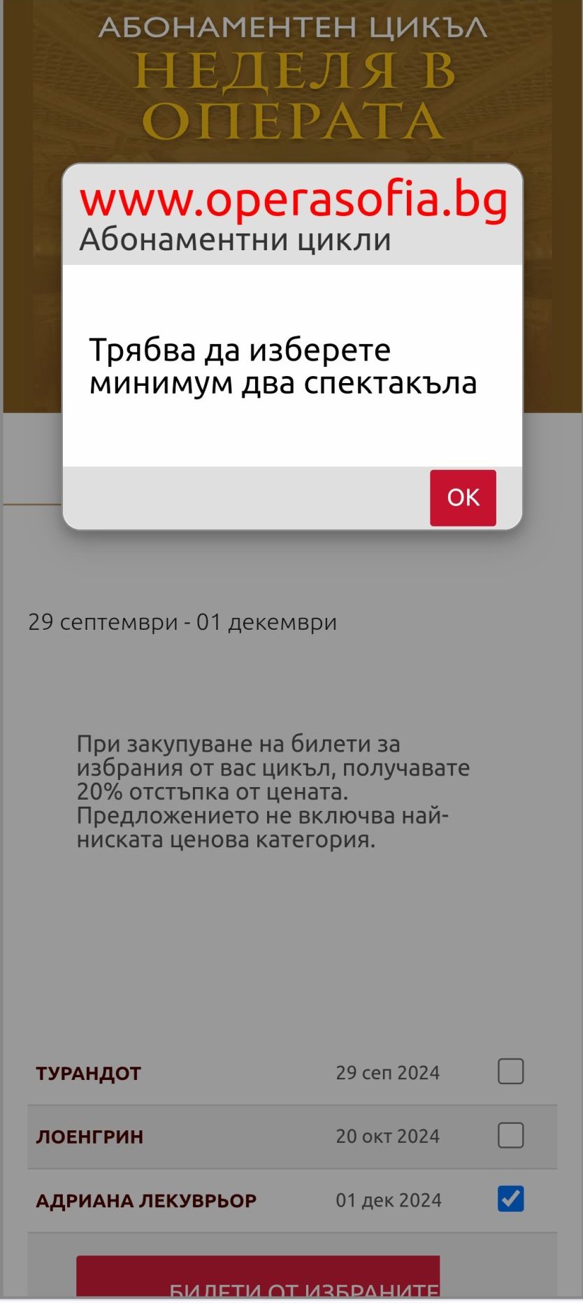 Другото - тези цикли, които предлагат, Неделя в операта например, цената която излиза е и за двата спектакъла, или ...?!? И ако аз купя да речем само за единия, тва място трябва да изчезне и за двата ...  А като отворя само да речем Турандот има малко останали места, а при двойните билети ми дава повече ... По моята логика, при двойните билети би трябвало да има по-малко места, отколкото при единичния ... не знам дали ме разбрахте ...