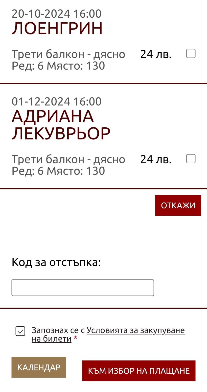 Наскоро имаше за Лоенгрин 30% отстъпка и купих (LOHENGRIN30).  Отдавна не бях ходил на 5-6 часова опера, та си възвърнах стария тренинг, хахаха.  И за други опери на Вагнер лятото имаше код WAGNER30, които ги пускат 5-7 дни преди представлените, като видят, че не са им продадени всички билети. Но тогава наистина има риск, да са изкупени хубавите места, които са на по-достъпна цена.