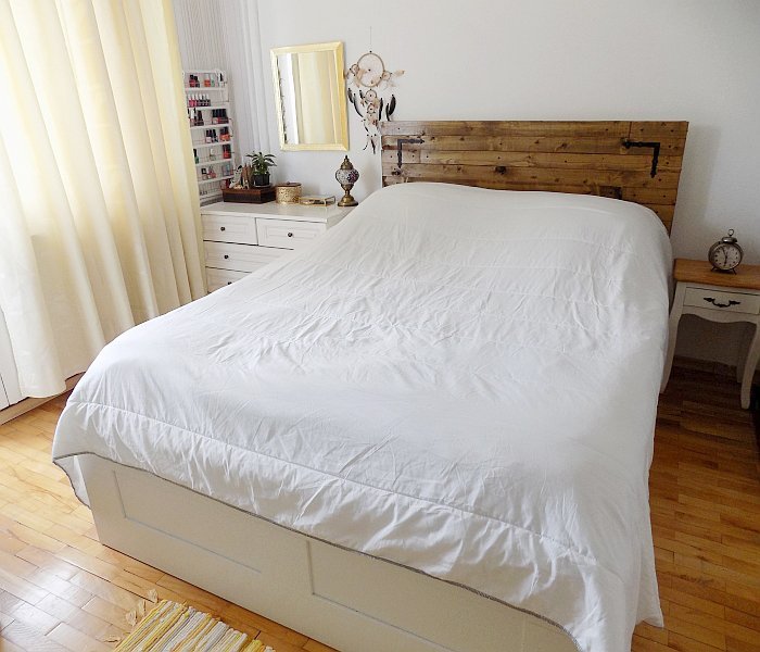 У нас спалнята е в екрю и златисто. Аз отначало се дърпах за цветовете, но стана хубаво.