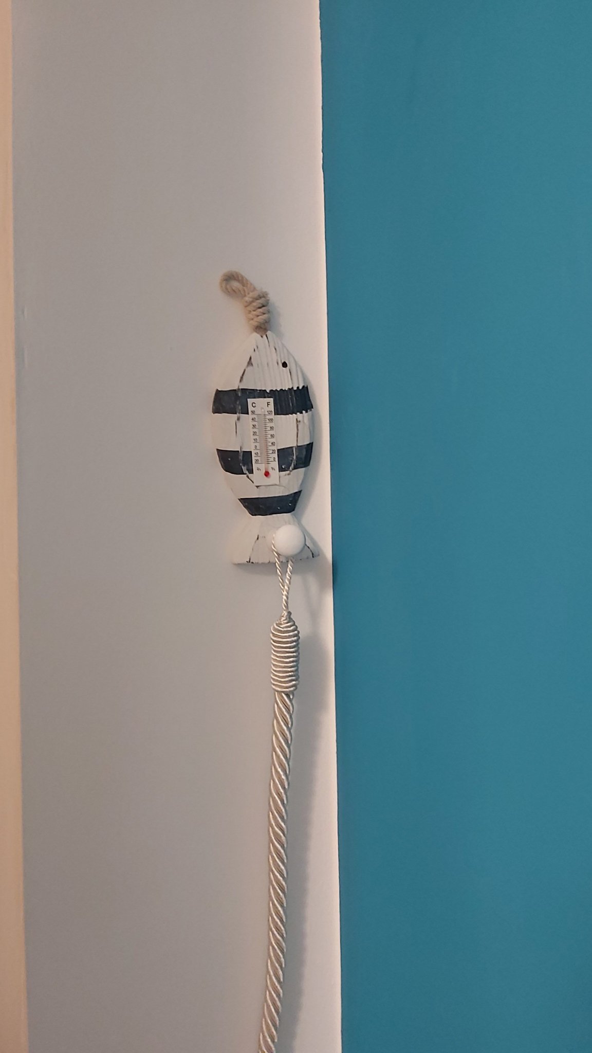 въженцето просто си виси и на никой не пречи, когато пердето не е прибрано и съответно е скрито от пердето Simple Smile пък може и да провериш каква е температурата в стаята.