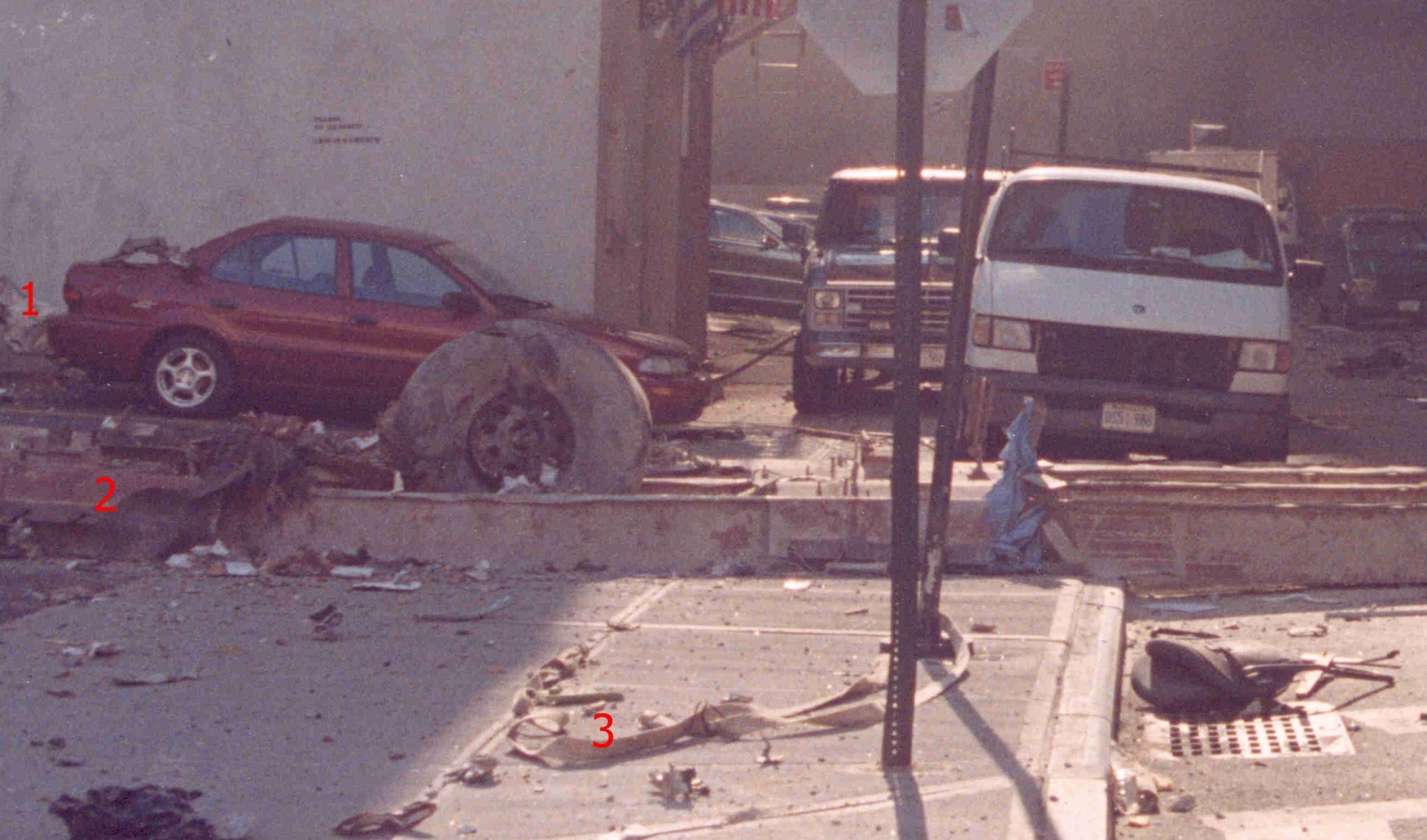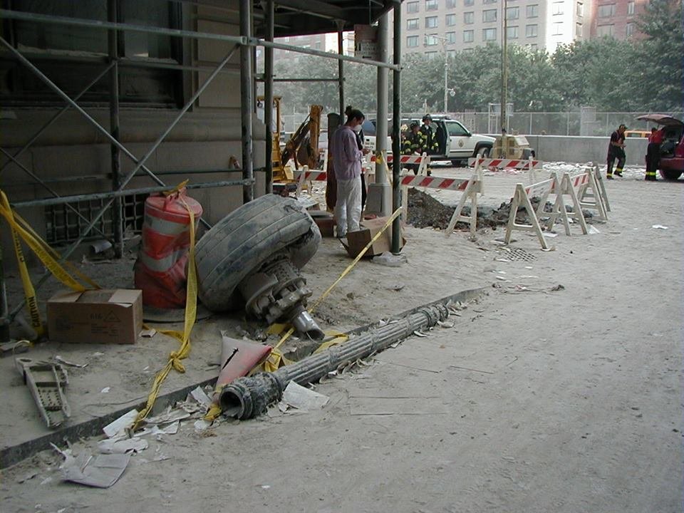 Това на тротоара е точно това, което остава от реактивен двигател на самолет, на който са опадали лопатките, след като се е забил в сграда, и е паднал от на майната си на плочника.