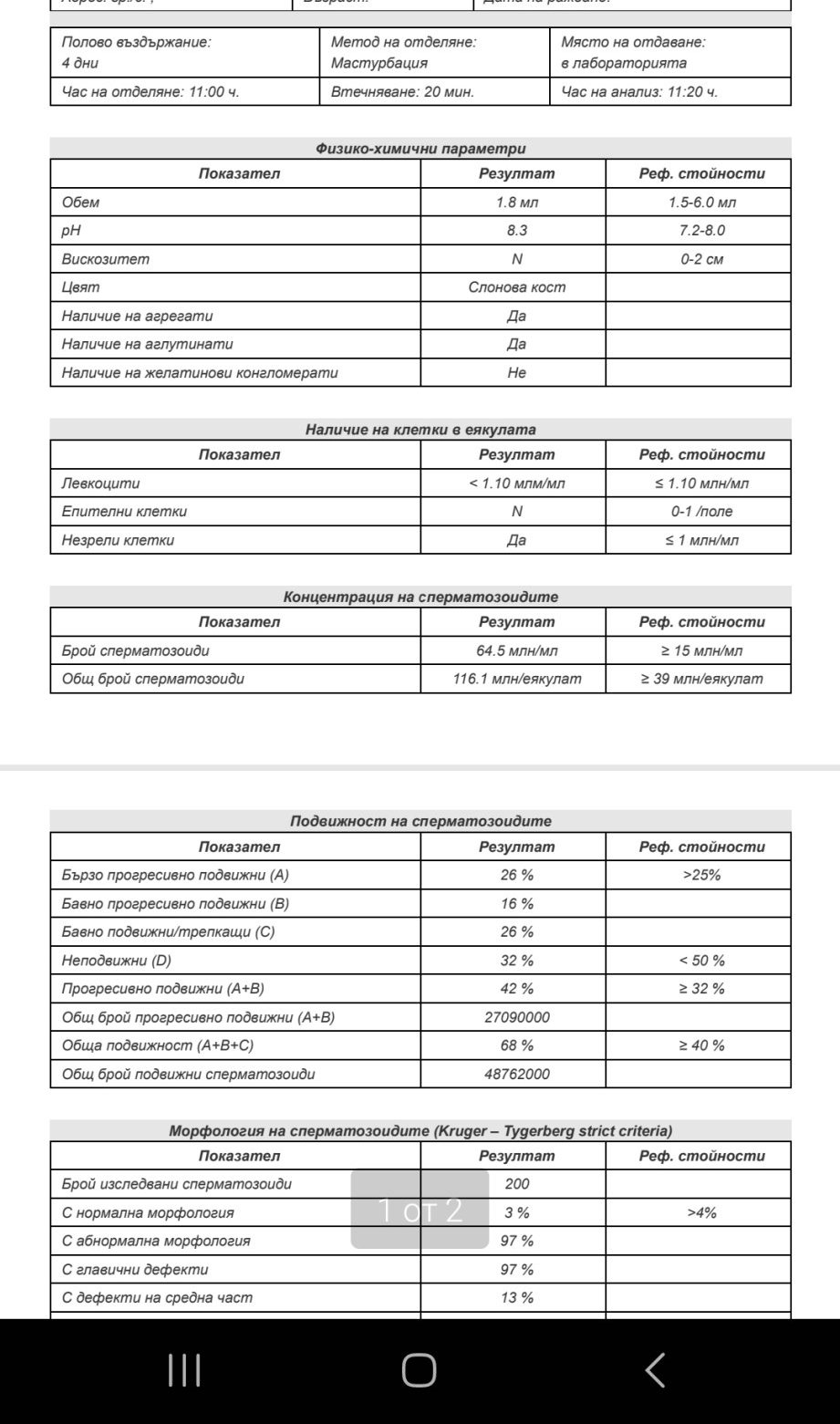 Здравейте. Направих си спермограма понеже с приятелката ми правим опити от доста време без резултат и заключението е Астенозоспермия. Ходих при док. КАЦАРОВ и той ми каза,че не са толкова лоши и ми изписа Полукс форте за 3 месеца и нещата щели да се поправят и било въможно и забременяване по нормален начин. Ето и резултатите, ако може някой с опит да ми каже дали наистина са зле нещата, ще съм благодарен. Спермограмата  еправена в клиника Щерев.