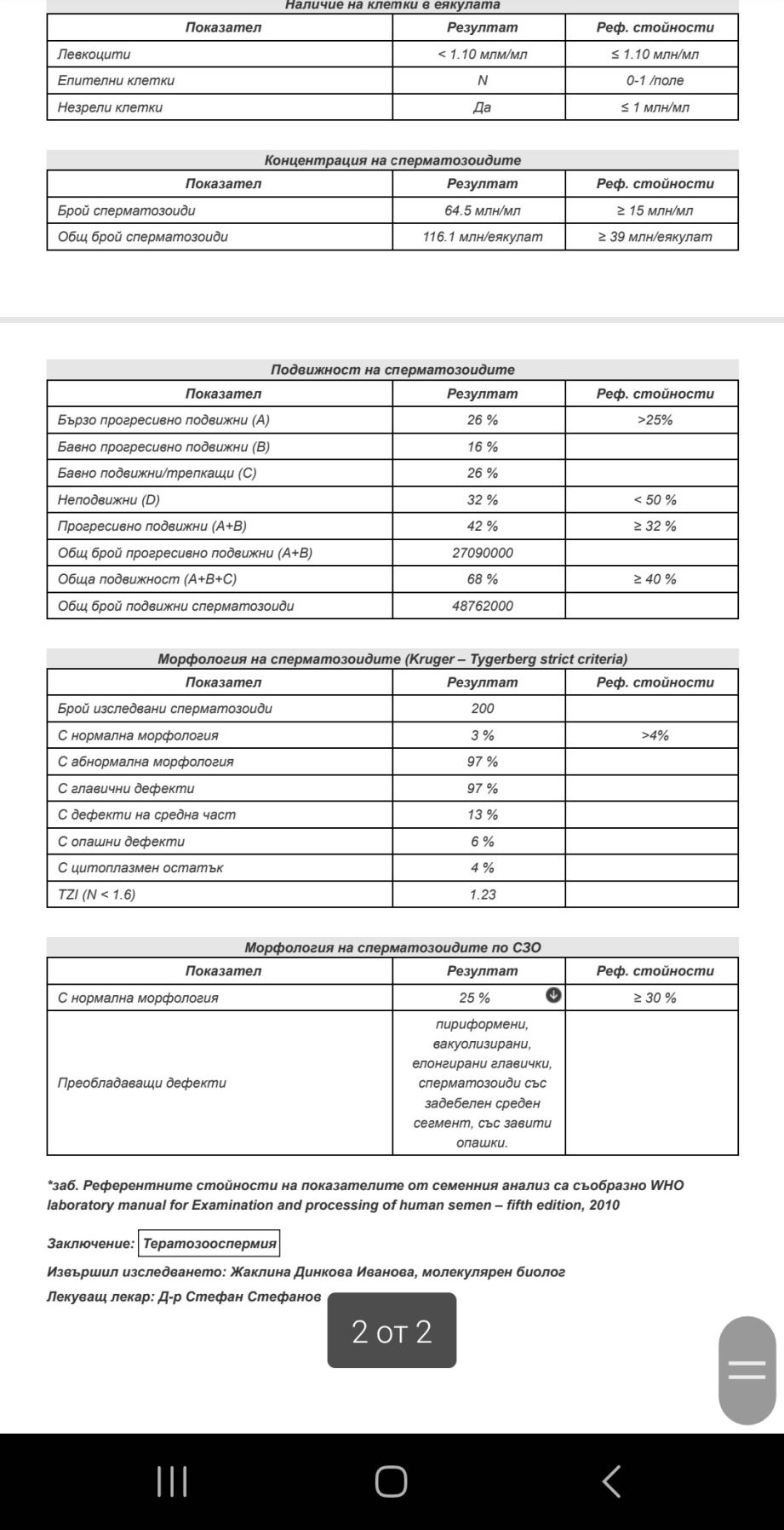 Препоръча ми втора спермограма след три месеца, но в различна клиника. Интересува ме такъв ли е принципа втората винаги да бъде в различна клиника? Според Вас при тези резултати възможно ли е забременяване по нормален начин?
