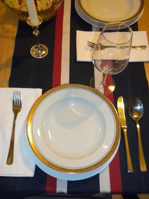 7нощи, според мен златните чинии с този рънър трудно ще съчетаеш... Може би бих ги сложила на някаква неутрална покривка - бяло, екрю, каквото имаш, и някаква златна свещичка в средата... Или ако имаш прибори от едно време от тези със златните кантове... Вариант е може би и с нещо сребърно, но трябва да се внимава да не стане претруфено.