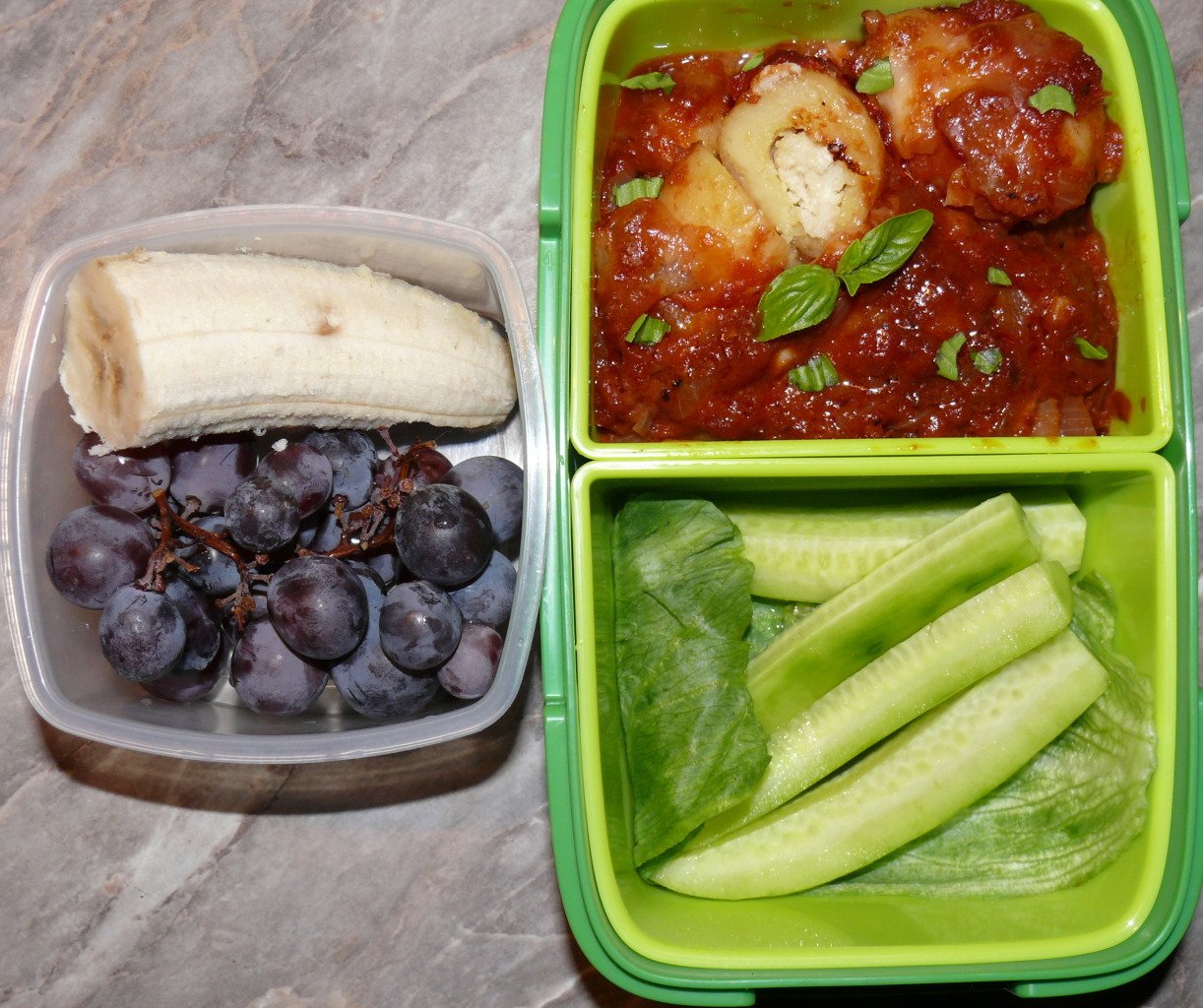 Днес - грозде, ябълка на парчета, половин краставица и малък сандвич с Филаделфия и пушена сьомга.
