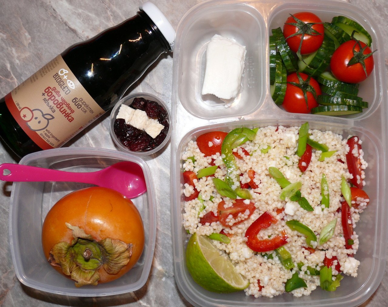 Обяд - просо със зеленчуци и сирене; черита, краставичка и сирене (домашно козе); сок био дива червена боровинка и ябълка