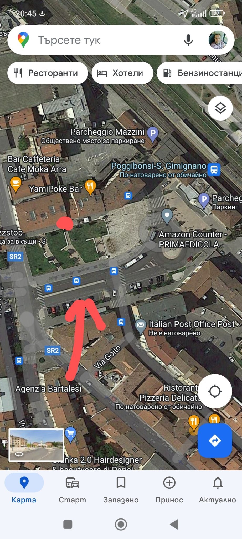 Влак Флоренция - Поджибонси. На снимката показвам къде спира автобуса за Сан Джиминяно ( стрелката ) и откъде купих билет ( точката ).