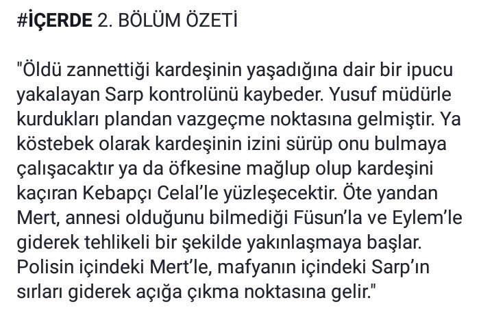 Сарп намира следа,която му показва, че брат му, когото смята за умрял, е жив..Тази следа ще го накара да загуби самоконтрол.. Той вече е на път да се откаже от плана, които са направили с директор Юсуф.. Или  ще продължава да бъде къртица и ще тръгне по следите на брат си и ще се опита да го намери.. Или ще се остави гневът му да го победи и да се изправи лице в лице с Джелял Кебапчията, който е отвлякъл брат му.. От друга страна Мерт, който не знае, че Фюсюн му е майка, ще продължава опасно да се сближава с нея и Ейлем.. Тайните на Мерт и Сарп, от които единият е вътре в полицията, а другият е вътре в мафията, ще са на път да излязат наяве..