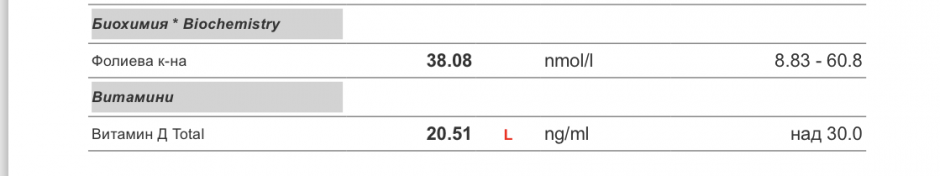 7-ми месец съм и цяла бременност попълвам дефицити, вече направо ми се плаче; б12 и Д май са що-годе окей, но ще продължавам да си ги суплементирам още малко. Но фолиева за първи път изследвам изобщо и резултатът ме смути..