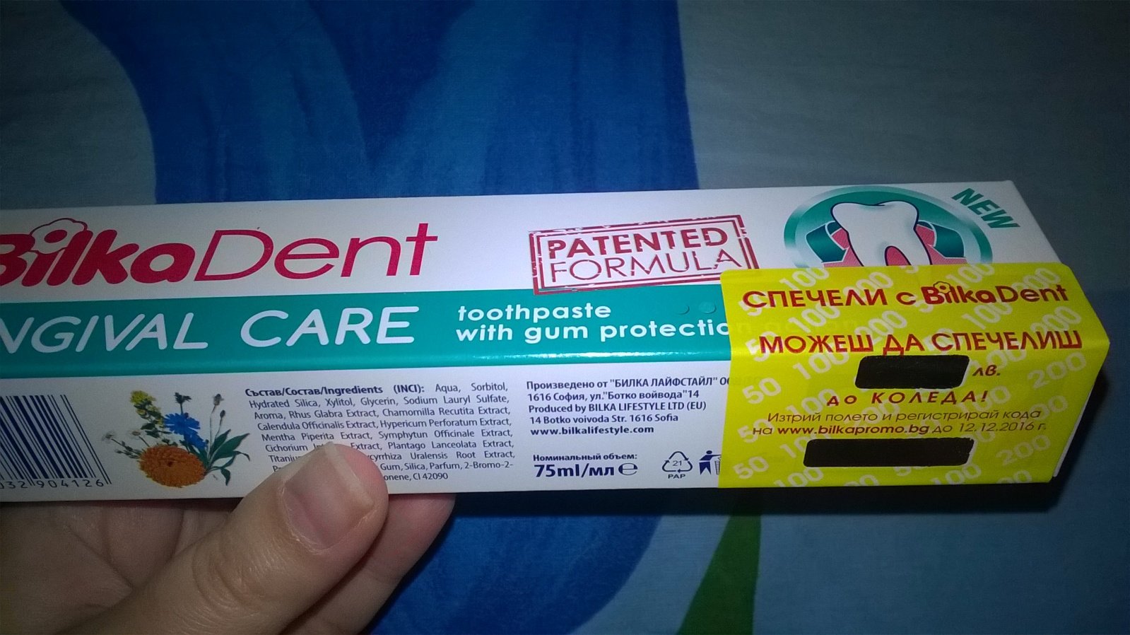 Тези дни някой питаше за промоционалната опаковка на паста за зъби „Билка“, но нямах възможност да снимам. Ето снимка, съжалявам за лошото качество, но мисля, че се вижда добре стикерът: