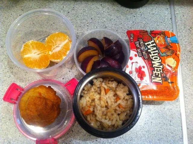 Днес: закуска - подарен хелоуински десерт, сл. закуска - мъфин и плодове, обяд - пиле с ориз
