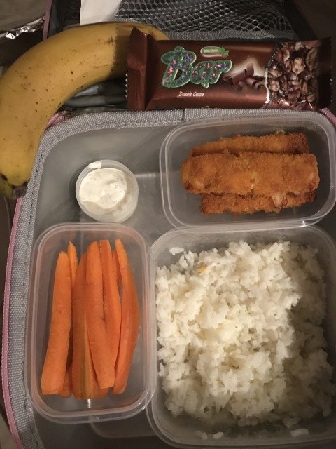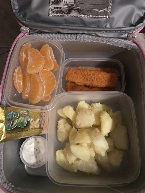 Вчерашното меню - шишче, салата снежанка+моркови на пръчки; 2 сандвича от дежурните с филе, кашкавал и домат; мандарина и плодово мляко. Върна ми само млякото, че нямала време да го изяде.
