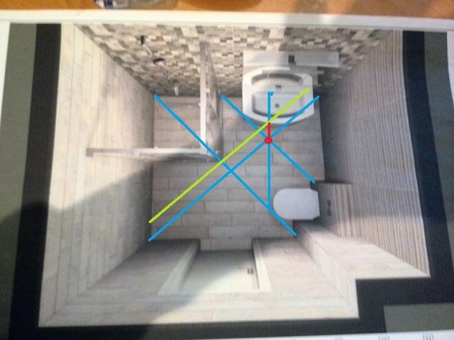 Ако ИМА праг няма никакъв проблем. В тази лявата част, където ти се пресичат синята и червената линии, подът се прави с наклон към тоалетната и от там се пречупва плавно към левия или десния ъгъл на мивката за да се сложи там сифона...